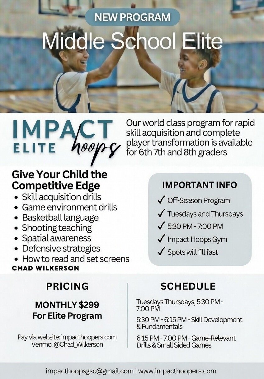 Impact Hoops Elite is a premier, high-energy basketball development program designed for serious middle school (6th–8th grade) and high school athletes who want to take their game to the next level. Focused on rapid skill acquisition and complete player transformation, sessions deliver world-class coaching in elite shooting, defensive strategies, spatial awareness, screen reading and setting, basketball IQ, skill-specific drills, game-environment reps, and small-sided games—all in a positive, supportive environment that builds confidence, character, and high-school/college readiness. With limited spots and fast-filling classes, Impact Elite helps dedicated players stay ahead of the competition and unlock their full potential.